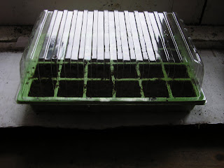 Twenty four modules have been sown in total with two seeds in each. I’m trying to restrict myself as I usually get carried away, sowing several packets and then giving them away to anyone I can persuade to take them. As we haven’t built the heated propagating bench yet (now expecting lots of family visits this year so funds have been re-directed to house decoration), I’m starting all my seedlings off in an unheated propagator that’s sitting on top of some thick corrugated cardboard in a south-facing window. Once germinated and transplanted I then move them into the tunnel.